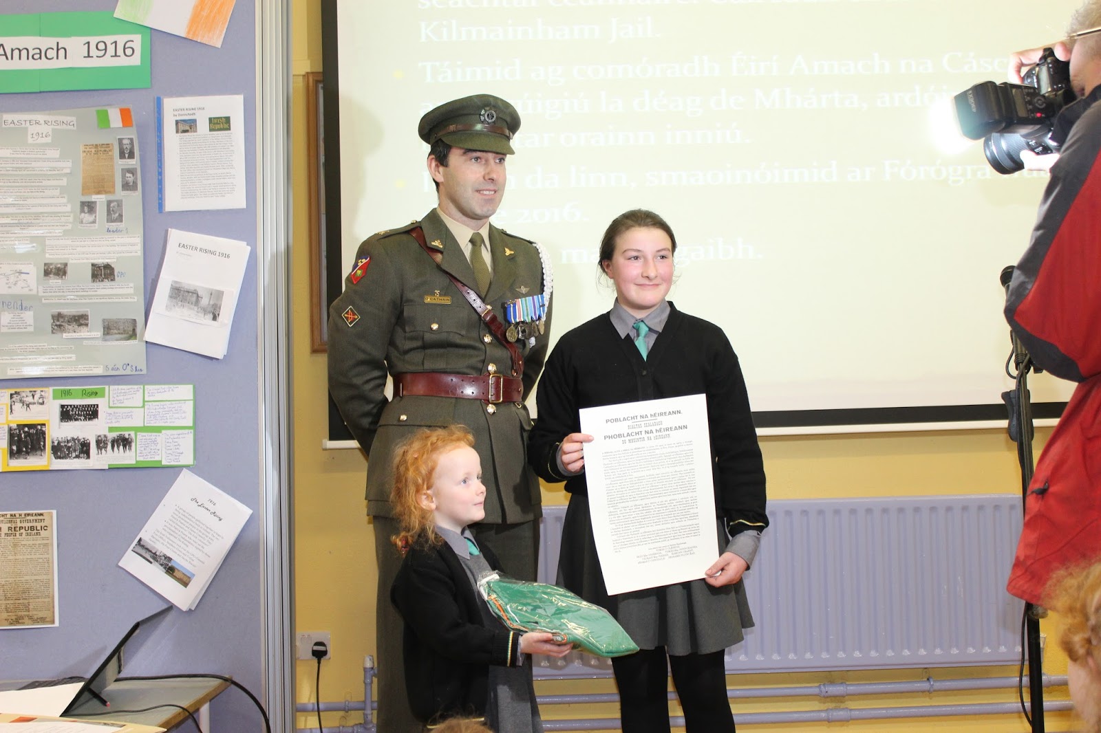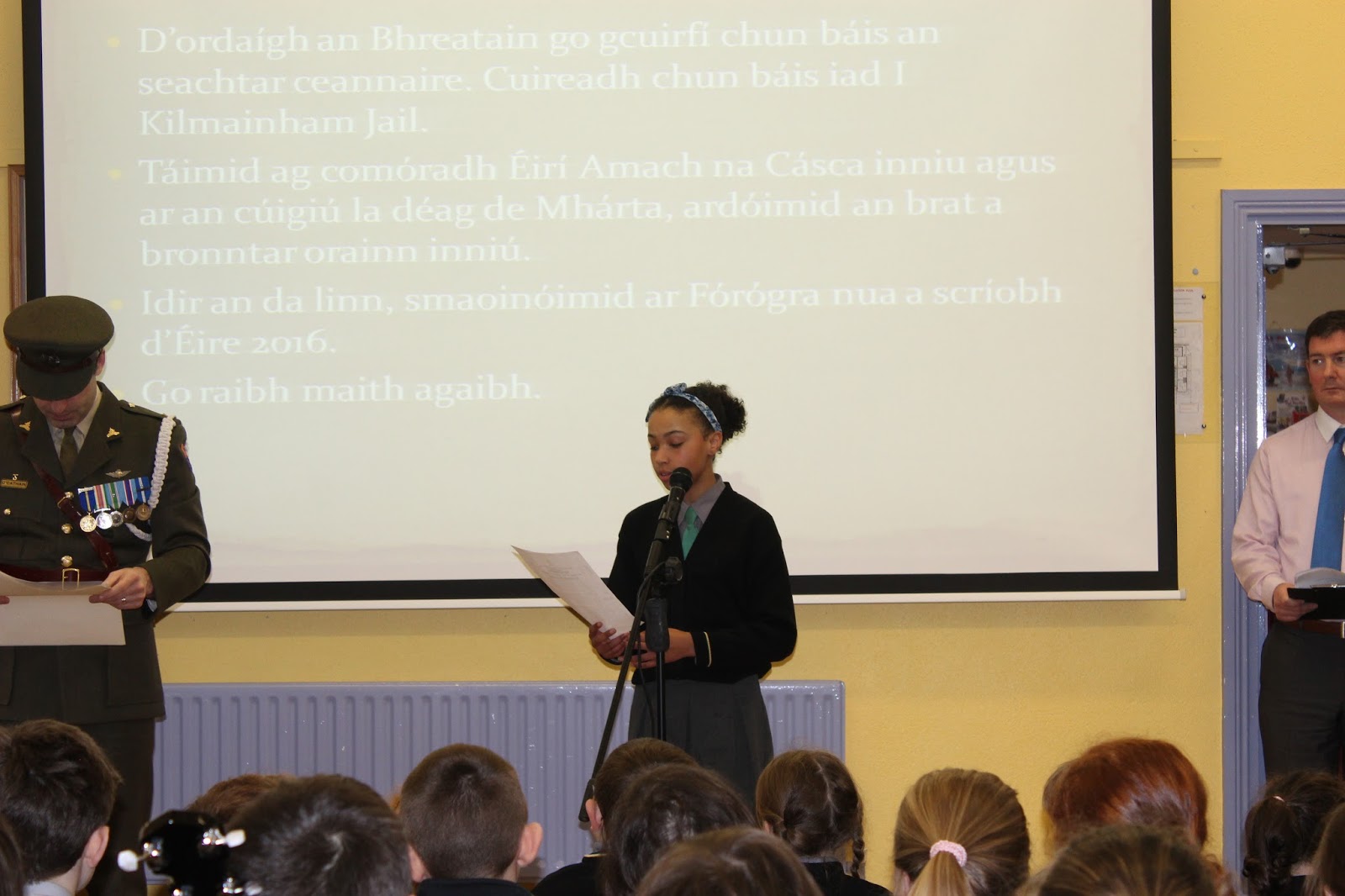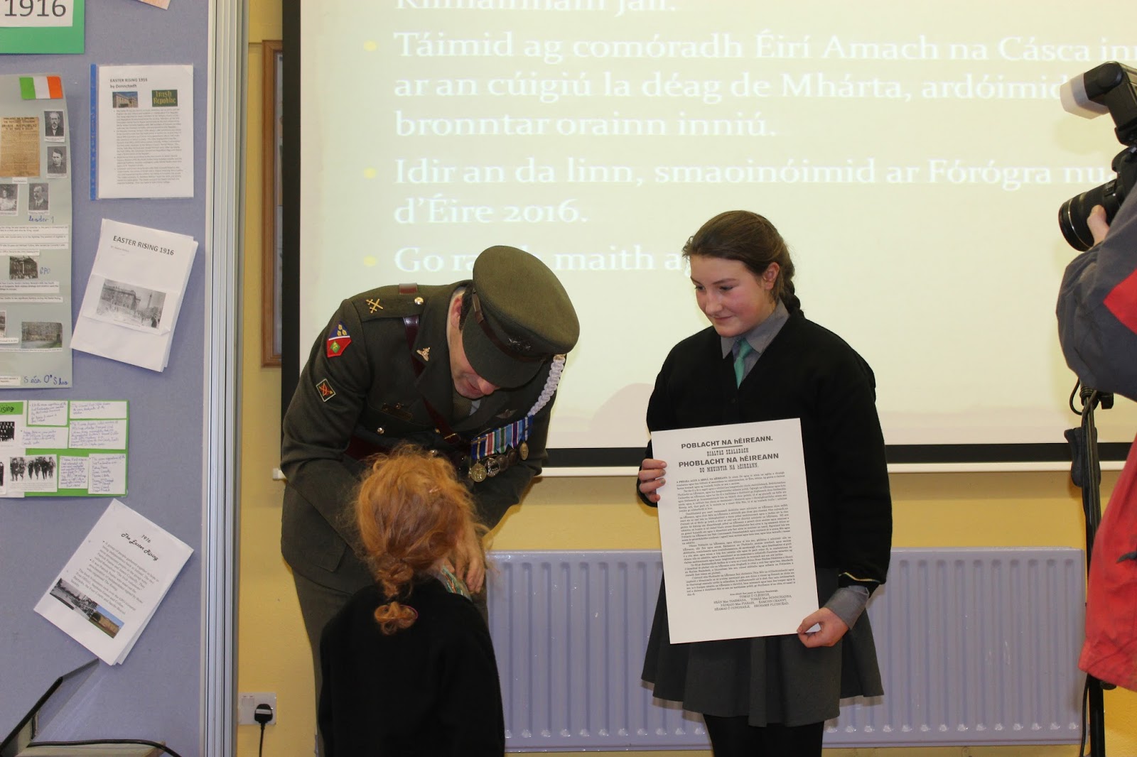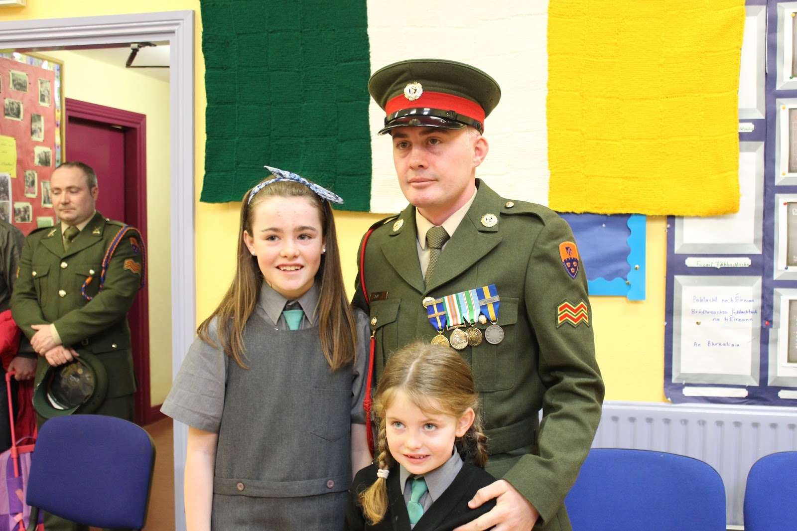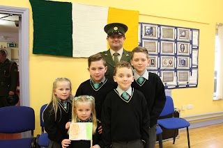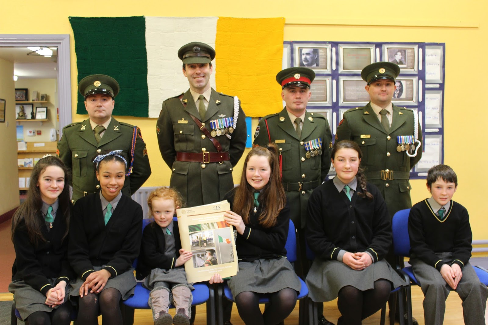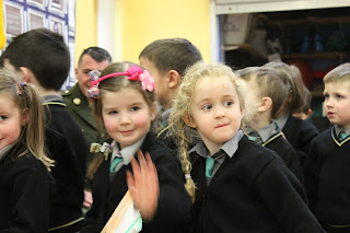 Tháinig uncail le muintir de Brún agus Uí Caomhánaigh ar chuairt maraon le Daid le muintir Uí Dhullaí. Thainig iar-scoláire Seán Mac an Fhallaigh lena athair Pádraig a bhunaigh an scoil nach mór 31 bhliain ó shin. Léigh daltaí ó rang a 6 - Aoife, Ciara agus Niall altanna as tionscnaimh a rinneadar ar 1916. Léirigh siad é seo ar Power point. Léigh Nadia altanna as an bhForógra de 1916. Lean seisiún beomhar ceisteanna agus freagraí é seo. D'fhreagair Ceannfort Ó Catháin ceisteanna na bpáistí faoi Óglaigh na hÉireann, 1916, an Bhratach Náisiúnta agus ar an saol san airm faoi láthair. Sheinn daltaí ó rang 3 - 6 Amhrán na bhFiann agus The Foggy Dew agus chan Rang 1 agus 2 Ó Ró S'e do Bheatha Bhaile. Ardóidh Gaelscoil Thomáis Daibhís an Bhratach Náisiúnta le linn searmanais speisialta eile ar an 15ú de Mhárta 2016 - Lá an Fhorógra. Beidh a bhforógra féin scríofa ag na páistí don lá sin ag déanamh machnaimh ar luachanna, smaointí agus ardmhianta páidtí sa lá atá inniu ann. B'ócáid iontach í agus beidh cuimhne go deo againn go léir ar chuairt an airm ar an scoil.