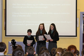 Ar dtús, léigh páistí ó ranganna éagsúla altanna ar stair na brataí agus ar 1916. Mhínigh Máire Ní Bhriain - Cathaoirleach an Bhoird Bhainistíochta, Niamh Ní Chormaic - Cathaoirleach Chumann na dTuismitheoirí agus Síle Ní Ríordáin - Leas-Príomh Oide na scoile cad a chiall an bhratach dóibh.
